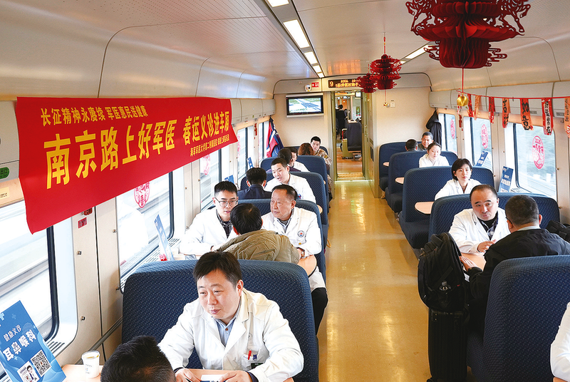 图①:3月3日,上海客运段与海军军医大学第二附属医院(上海长征医院)联合开展“春运义诊进车厢”活动,由该院11名医生组成的义诊团队,在上海站开往南京南站的D956次列车上开设流动诊室,为旅客提供义诊服务。(通讯员 许昌乐 摄)