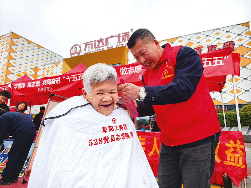 图②:阜阳工务段倡导职工积极参加社会公益活动,履行社会责任,弘扬雷锋精神。图为3月3日在阜阳市志愿服务集市,该段探伤车间“528”党员志愿服务站成员为市民提供义务理发服务。 (通讯员 吕树明 摄)