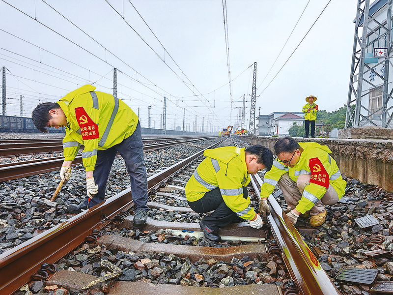 图③:合肥电务段将学雷锋活动与岗位建功紧密结合,围绕设备养护维修等重点工作成立突击队,在攻坚克难中充分发挥党团员的骨干和生力军作用。图为该段涡阳信号车间青年突击队在青町站进行换轨施工。(通讯员 费璇 摄)