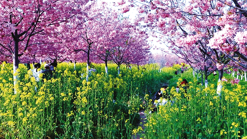 放眼望去,樱花树下皆是赏花的人。漫山遍野开满樱花,我和朋友徜徉其中,每一口新鲜空气都让人心旷神怡。离开喧闹的城市,走进大自然深处,我感到身心放松,心情愉悦。在这大自然里无拘无束,只有竞相绽放的樱花。