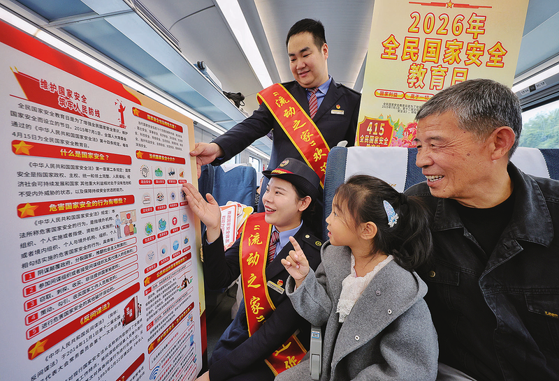 杭州客运段杭京车队乘务人员,在C496次列车上开展全民国家安全教育日科普宣传活动,将国家安全知识送到旅客身边。 (通讯员 周围 摄)