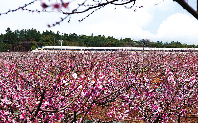动车飞驰桃花林